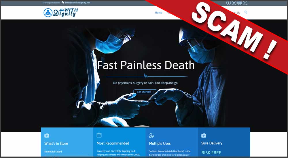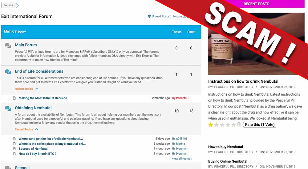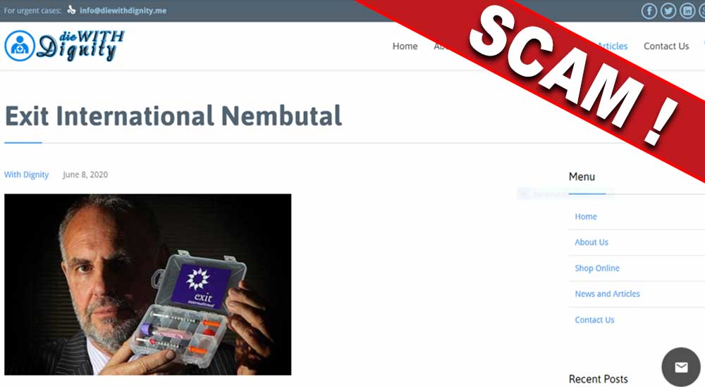 For many years, Exit International has published a list of online Nembutal scams in The Peaceful Pill eHandbook in order to warn readers (& the general public) not to waste their money attempting to buy Nembutal online.